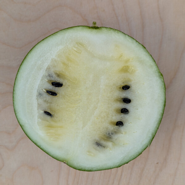 • Una antigua y robusta variedad rusa de sandía, con pulpa blanca de sabor ligero, que prospera en climas nórdicos.
